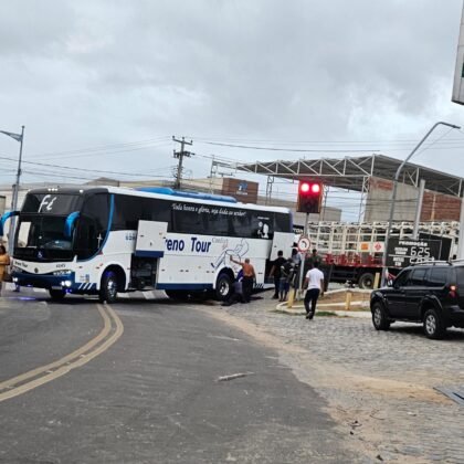 Ônibus de turismo com fiéis fica preso em rampa no bairro Pompéia, em Quixeramobim.