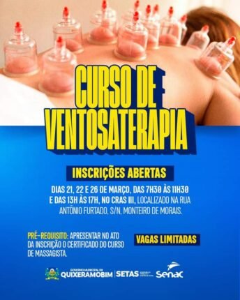 A Prefeitura Municipal de Quixeramobim por meio da Secretaria do Trabalho e Assistência Social, em parceria com o SENAC, informa que estão abertas as inscrições para o curso de Ventosaterapia. O curso é totalmente gratuito e os interessados devem se inscrever no CRAS III no bairro Monteiro de Morais. O início do curso está previsto […]