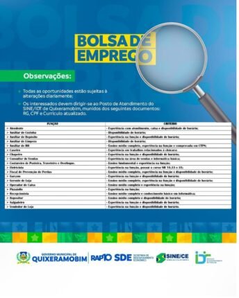 Confira as oportunidades disponíveis na Bolsa de Emprego SINE/IDT de Quixeramobim e Quixadá para esta segunda-feira (21/07): 📍 Quixeramobim Interessados devem comparecer ao posto do SINE/IDT local munidos de RG, CPF e currículo atualizado. 📞 Telefone: (85) 3305-8579 Ramal 3301 As vagas podem ser alteradas a qualquer momento. Atendente – Experiência com atendimento, caixa e […]