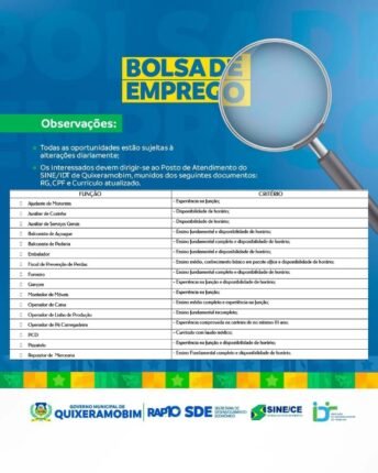 Confira as oportunidades disponíveis na Bolsa de Emprego SINE/IDT em Quixeramobim e Quixadá para esta segunda-feira (13/10): 📌 Vagas – Quixeramobim 📞 Telefone: (85) 3305-8579 Ramal 3301 📍 Local: Posto do SINE/IDT de Quixeramobim 🗂️ Documentos: Levar RG, CPF e currículo atualizado ⚠️ Importante: As vagas podem ser alteradas a qualquer momento Ajudante de Motorista […]