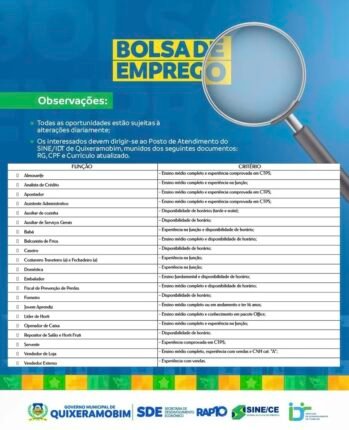 Confira as oportunidades disponíveis na Bolsa de Emprego SINE/IDT em Quixeramobim para esta segunda-feira (20/04): Vagas – Quixeramobim Telefone: (85) 3305-8579 Ramal 3301 Local: Posto do SINE/IDT de Quixeramobim Documentos: Levar RG, CPF e currículo atualizado Importante: As vagas podem ser alteradas a qualquer momento. ➢ Ajudante de Motorista – Disponibilidade de horário; ➢ Auxiliar de Escritório […]