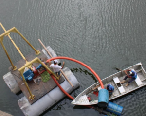 O nível da água está tão baixo que inviabiliza totalmente sua captação por gravidade à nossa Casa de Bombas, sendo necessária a instalação de motores extras para coletar as águas superficiais que ainda restam no manancial.