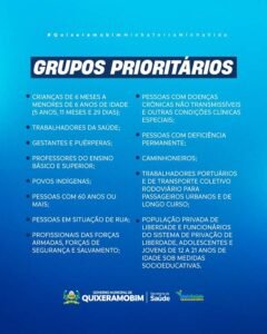 Confira se você faz parte do grupo prioritário e não deixe de se vacinar. Procure a Unidade de Saúde mais próxima de você e garanta sua proteção.
