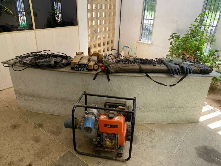 Durante o trabalho policial, as Forças de Segurança do Ceará apreenderam um motor diesel, um motor elétrico, dois rolos de fios elétricos de espessura diversas, um rolo de cabos, um refletor elétrico, um reator elétrico, dois celulares, cinco chaves magnéticas, uma haste montável para desligar redes de energia e um par de luvas isolantes.