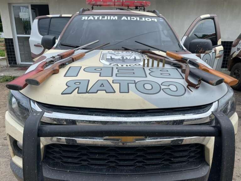 Diante da denúncia, as equipes se deslocaram até o imóvel para averiguar os fatos. Com a autorização do morador, os militares adentraram na casa e comprovaram a informação. Lá, foram apreendidas duas armas. Em uma outra residência em Mombaça apontada pelo suspeito foram encontradas outras duas. No total, foram apreendidas quatro espingardas, sendo de calibres 36, 32, 28 e 12; além de munições.