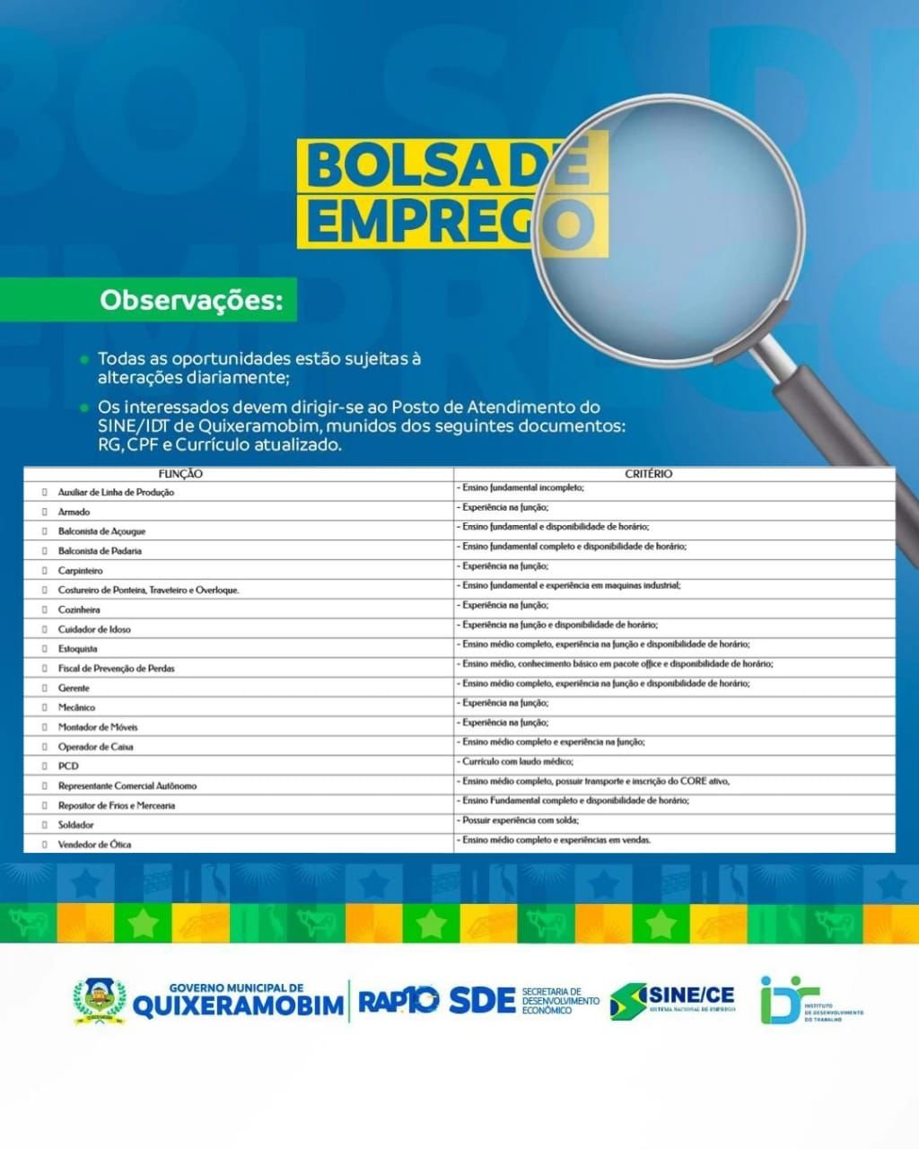 Confira as oportunidades disponíveis na Bolsa de Emprego SINE/IDT em Quixeramobim para esta quarta-feira (10/09):