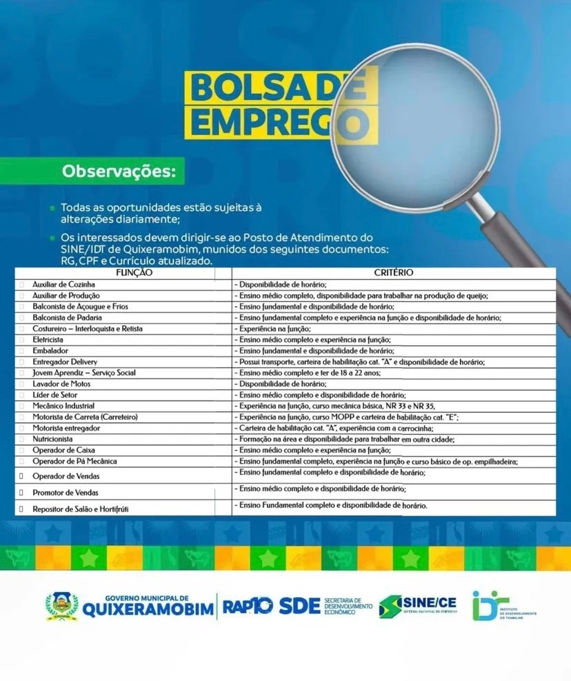 Confira as oportunidades disponíveis na Bolsa de Emprego SINE/IDT em Quixeramobim para esta segunda-feira (15/12):