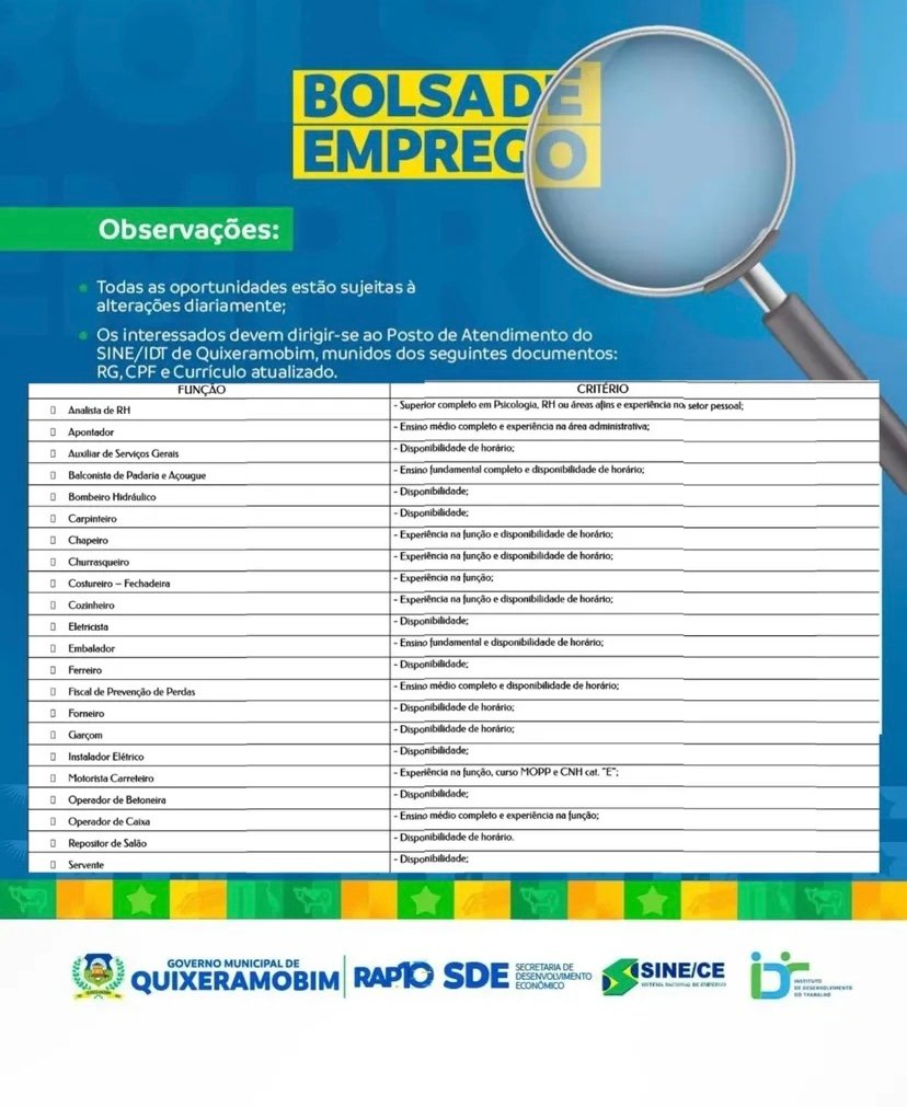 Bolsa de emprego em Quixeramobim.