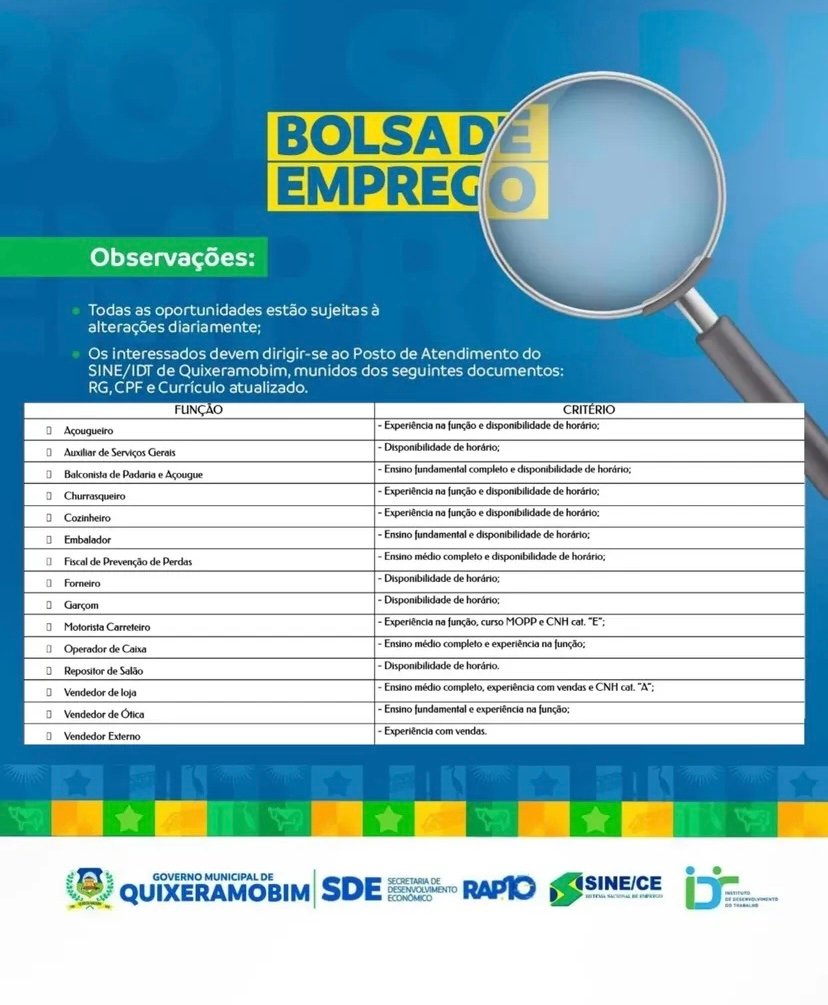 Confira as oportunidades disponíveis na Bolsa de Emprego SINE/IDT em Quixeramobim para esta segunda-feira (30/03):