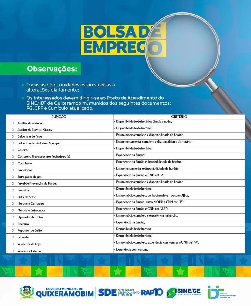 Confira as oportunidades disponíveis na Bolsa de Emprego SINE/IDT em Quixeramobim para esta terça-feira (14/04):