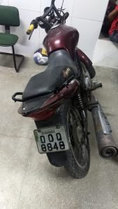 Ao ser abordado foi constatado a motocicleta de placa OOQ-0840 a placa estava adulterada com fita isolante e que a placa real era OCQ-0840, roubada no dia 02/10/2018, no Bairro Baviera.