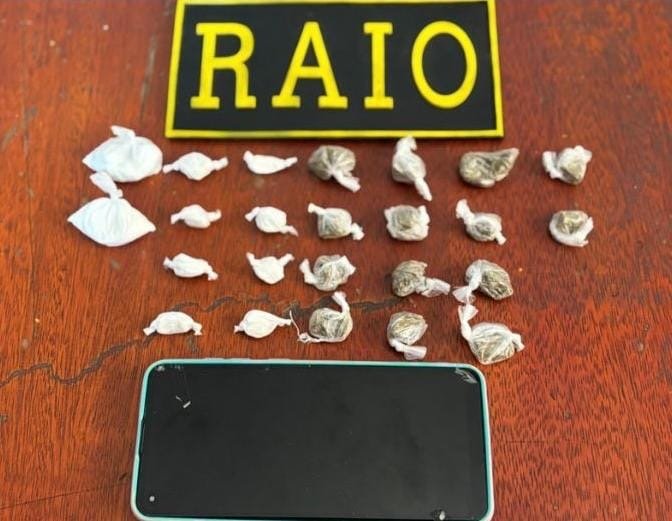 Com apoio das viaturas do Policiamento Ostensivo Geral (POG) de números 9601 e 9641, a composição conseguiu capturar L. da S. F., que estava em posse de 10 porções de cocaína (15g) e 15 trouxinhas de maconha (15g), além de um celular Samsung. Já o segundo envolvido conseguiu fugir e segue foragido. A arma de fogo utilizada também não foi localizada.