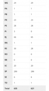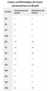 As secretarias estaduais de Saúde divulgaram, até 18h40 desta quinta-feira (18), 635 casos confirmados de novo coronavírus (Sars-Cov-2) no Brasil em 21 estados e no Distrito Federal. O último balanço do Ministério da Saúde, divulgado na tarde desta quinta, contabiliza 621 infectados. O Piauí identificou os três primeiros casos da doença no estado.