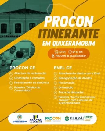 O PROCON Ceará realizará, no próximo dia 10 de abril, uma ação especial de atendimento ao público no município de Quixeramobim. A iniciativa tem como objetivo oferecer suporte à população na resolução de demandas relacionadas aos direitos do consumidor. Os atendimentos acontecerão na sede do PROCON local, no horário das 8h às 16h, reunindo uma […]