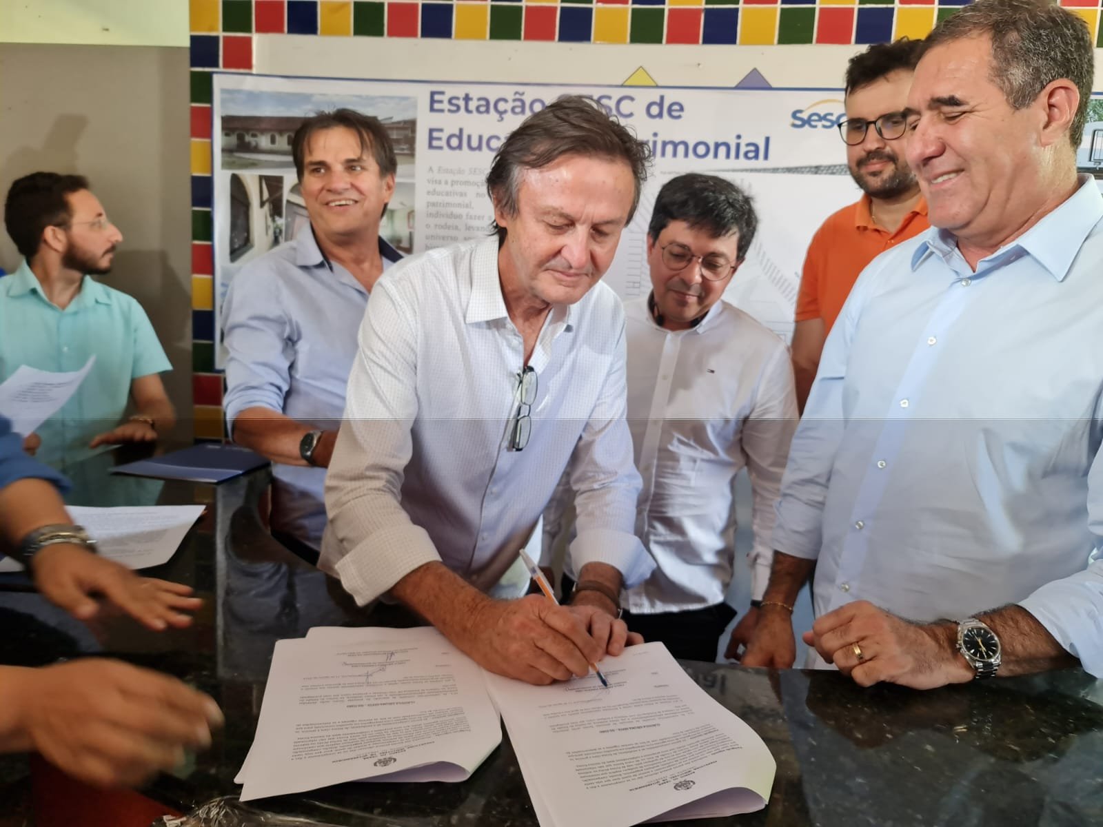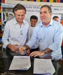 O prefeito Cirilo Pimenta, ao lado de Luiz Gastão, presidente do Sistema Fecomércio, assinou o Termo de Cessão de uso da Antiga Estação Ferroviária de Quixeramobim, marcando o início da restauração do prédio e seu entorno.
