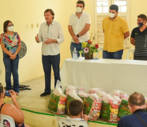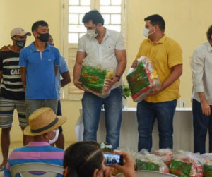 Cirilo Pimenta juntamente com o Secretário Karlus André realizam entregas de cestas básicas aos associados da Associação de Catadores de resíduos sólidos de Quixeramobim.