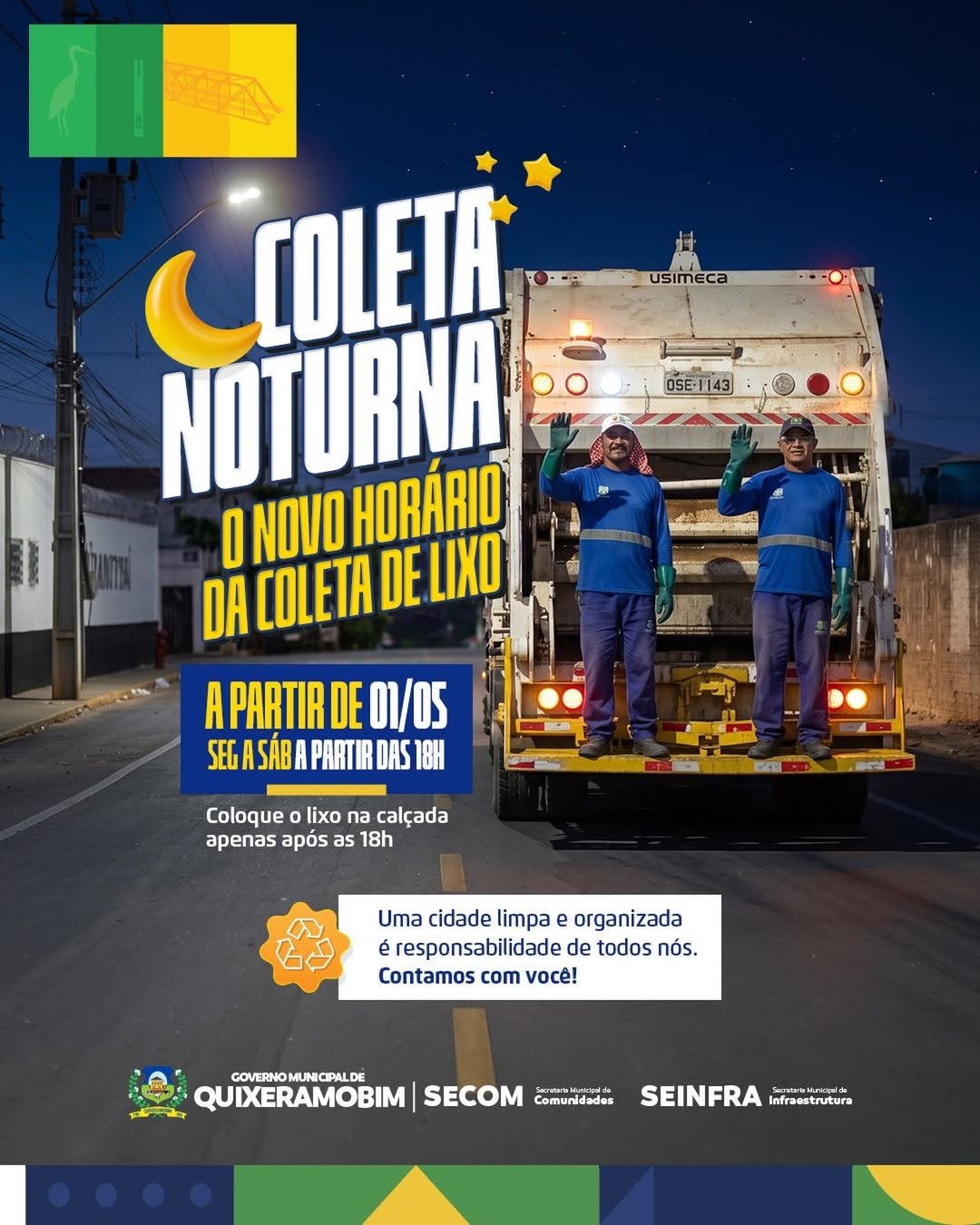 De acordo com a mudança, os caminhões de coleta irão circular no período noturno, de segunda a sábado, com início das atividades sempre a partir das 18h. A medida busca evitar que o lixo permaneça nas calçadas sob o sol por longos períodos, o que pode causar mau cheiro e atrair animais.