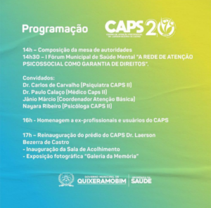 Confira toda a programação e venha festejar com a gente esses 20 anos de muito trabalho e dedicação à saúde mental dos quixeramobinenses.
