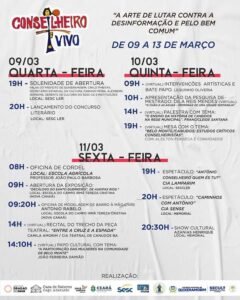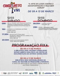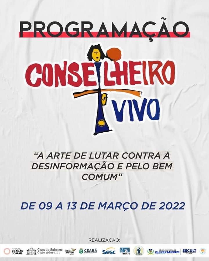 O Conselheiro Vivo 2022 começa nesta quarta-feira, 9 de março, e se estende até domingo, 13 de março, data do aniversário de 192 anos de Antônio Conselheiro, líder de Canudos. Ainda em decorrência da pandemia de Covid-19, a programação do evento será realizada de forma híbrida – presencial e com transmissões pela internet.