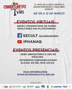 A solenidade de abertura do Conselheiro Vivo 2022 será às 19 horas, no SESC Ler com as presenças do Secretário Estadual da Cultura, Fabiano Piúba; do prefeito de Quixeramobim, Cirilo Pimenta; e do gerente de Cultura do SESC-CE, Alemberg Quindins; além de entidades organizadores e agentes culturais participantes.
