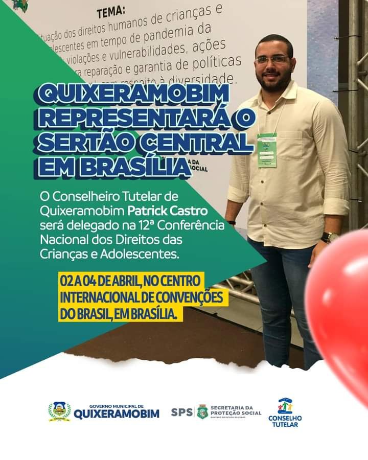 O Conselheiro Tutelar de Quixeramobim estará representando nossa cidade na 12ª Conferência Nacional dos Direitos das Crianças e Adolescentes, que acontecerá de 02 a 04 de abril, no Centro Internacional de Convenções do Brasil, em Brasília.