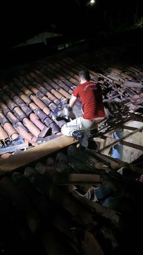 O Corpo de Bombeiros Militar do Estado do Ceará (CBMCE) resgatou, na madrugada desta sexta-feira (09), uma vaca que estava em um telhado, no município de Baturité.