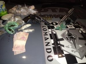Os PMs localizaram 14 gramas de cocaína e 13 gramas de maconha, sendo que a cocaína já estava pronta para venda, divida em pacotes. Quando foi questionado sobre armas, o adolescente respondeu que tinha escondido no quintal de outra casa, que tinha acesso pelos fundos. A composição foi até ao local, que era aberto, e localizaram uma pistola calibre. 380, municiada com 19 munições do mesmo calibre, sendo apreendido, ainda, no mesmo local, um revólver cal.38 com seis munições.