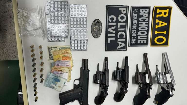 Ainda durante as diligências, quatro revólveres calibre 38, uma pistola calibre 40, 19 munições, uma quantia em dinheiro, 150 comprimidos de “rebite”, seis aparelhos celulares, uma motocicleta com registro de roubo e cinco gramas de cocaína também foram apreendidos.