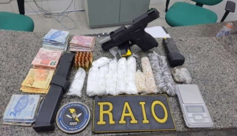 Por volta de 19h30, os policiais militares foram até o local e se depararam com o suspeito, que ao notar a presença das composições do CPRaio se desfez de um saco plástico e tentou se evadir, sendo abordado em seguida portando uma pistola de calibre 9mm com 23 munições intactas. A sacola plástica foi apreendida também e dentro havia cocaína (97 gramas), maconha (40 gramas), crack (19 gramas), balança de precisão e dinheiro em espécie.