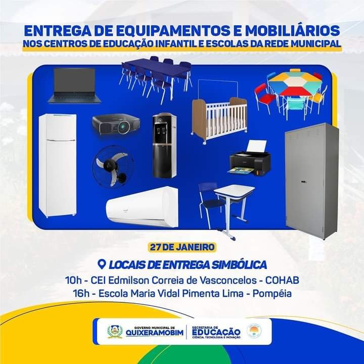 Em 2021, a Prefeitura Municipal de Quixeramobim, a partir da Secretaria Municipal de Educação, investiu quase R$ 6 milhões na aquisição de equipamentos e mobiliários para os Centros de Educação Infantil e Escolas da rede municipal. Com o valor, foram adquiridos: computadores, impressoras, notebooks, centrais de ar, caixas de som, geladeiras, freezers, geláguas, máquinas de lavar, armários, carteiras universitárias e outros itens necessários para garantir o conforto e o estímulo à aprendizagem dos alunos. A Prefeitura ainda investiu outros R$ 185 mil na compra de material de copa e cozinha a serem distribuídos nas referidas instituições de ensino.