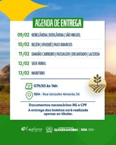 Os agricultores e agricultoras cadastrados no programa Garantia Safra 2025/2026 devem ficar atentos ao calendário de entrega dos boletos, que acontece entre os dias 9 e 13 de fevereiro, das 7h30 às 14h, na Secretaria de Desenvolvimento Agrário (SDA), localizada na Rua Idelzuite Almeida, nº 56.