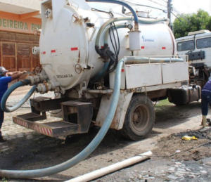 Manutenção na Rede de Esgoto na Rua Dom Hélio Campos. Esgotamento do Poço de Visita – PV, com auxílio do Caminhão Fossa e desobstrução a rede de esgoto.
