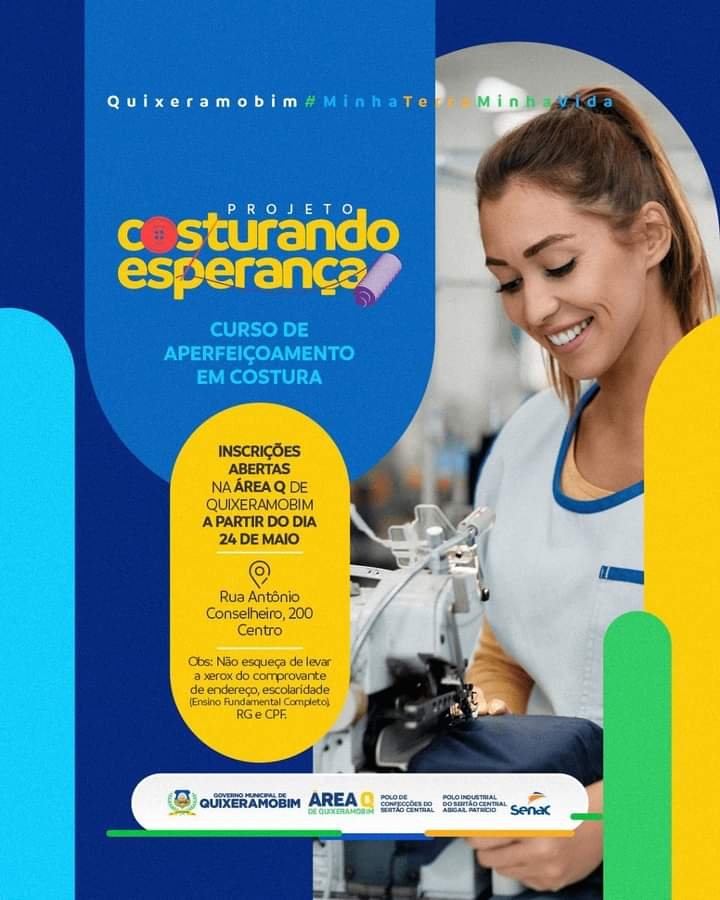 A Prefeitura Municipal de Quixeramobim, por meio da Área Q, informa a abertura de novas vagas para o curso de Aperfeiçoamento em Costura em parceria com o Senac.