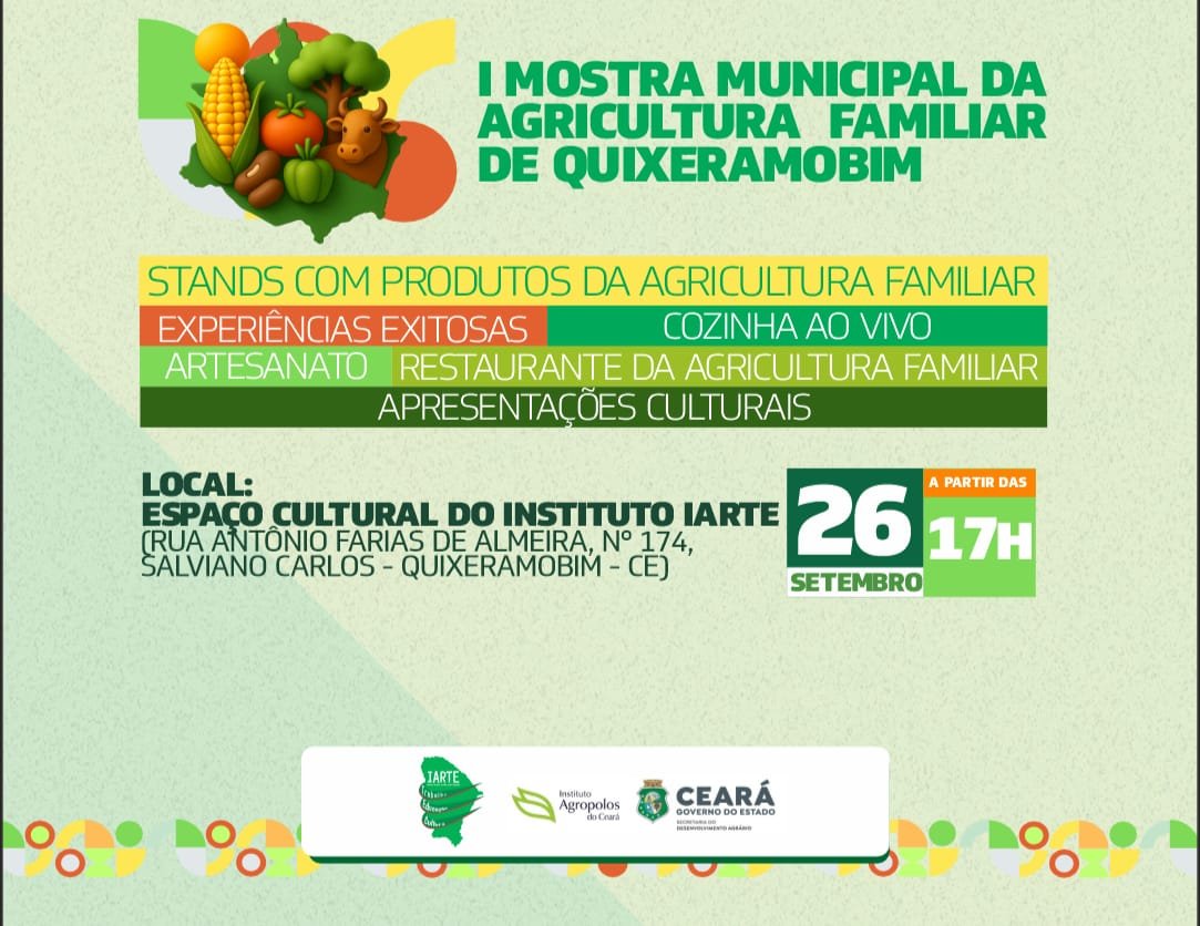 No próximo dia 26 de setembro, o Instituto Iarte realizará a 1ª Mostra Municipal da Agricultura Familiar de Quixeramobim, evento que marcará a celebração dos 16 anos de atuação da instituição em prol do desenvolvimento rural e social no Estado do Ceará.