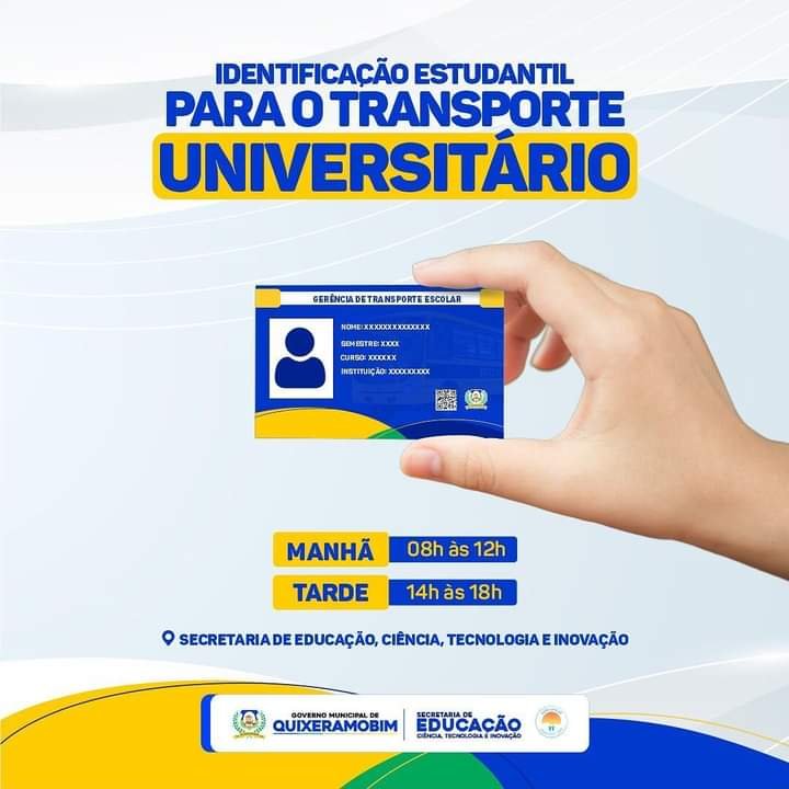 Chegou a hora de renovar ou solicitar a identificação estudantil. Para realizar a solicitação, é necessária que o estudante compareça à Secretaria de Educação, Ciência, Tecnologia e Inovação, no Setor de Transporte Escolar, nos horários: 08h às 12h e de 14h às 17h3.