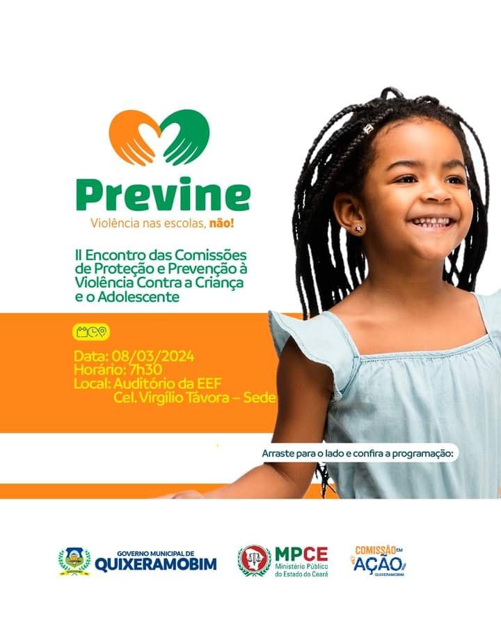 Na próxima sexta-feira (8), a Secretaria de Educação de Quixeramobim vai promover o II Encontro das Comissões de Proteção e Prevenção à Violência Contra a Criança e Adolescentes, com o objetivo de fortalecer a proteção e a prevenção de casos violência nas escolas. O evento contará com a presença do presidente da Comissão de Direitos Humanos e Cidadania e do Comitê de Prevenção e Combate à Violência da Assembleia Legislativa do Ceará, Renato Roseno.