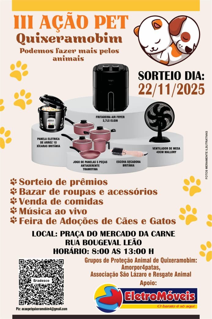No próximo dia 22 de novembro de 2025, Quixeramobim será palco de mais uma edição da Ação Pet, evento que chega à sua terceira edição com o lema “Podemos fazer mais pelos animais”. A iniciativa tem como objetivo arrecadar recursos e fortalecer as ações de proteção animal no município, além de promover um dia de integração, solidariedade e diversão.