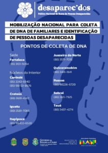 A campanha, que ocorre de 26 a 30 de agosto, visa coletar amostras de DNA de familiares próximos de pessoas desaparecidas. Em todo o Brasil, mais de 200 pontos de coleta estão disponíveis para essa finalidade. No Ceará, os interessados podem se dirigir à sede da Pefoce, em Fortaleza, ou a um dos nove núcleos da Pefoce no interior do estado, localizados em Juazeiro do Norte, Sobral, Tauá, Canindé, Russas, Crateús, Quixeramobim, Iguatu e Itapipoca.