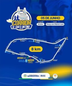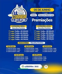 Conforme divulgado na última segunda-feira (09), as inscrições para a Corrida de Santo Antônio foram iniciadas. Seguem nas imagens acima as informações quanto as premiações da categoria geral (masculino/feminino), categoria local (masculino/feminino) e por faixa etária, aqueles que realizarem suas inscrições de forma gratuita ao concluir o percurso de 8km também terá direito a medalha de participação. Apresentamos também o percurso de 8km da nossa tradicional corrida, ponto de largada e chegada, pontos de hidratação e ruas pelas quais os corredores deverão percorrer até a conclusão da corrida.