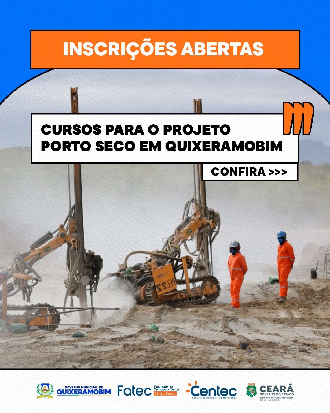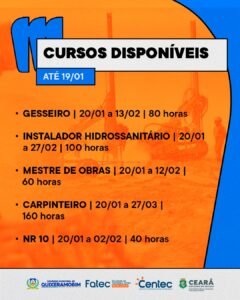 O Instituto Centec, em parceria com a Prefeitura de Quixeramobim, está ofertando cursos gratuitos de qualificação profissional voltados ao Projeto Porto Seco, com foco em quem busca formação rápida e novas oportunidades na área da construção civil.