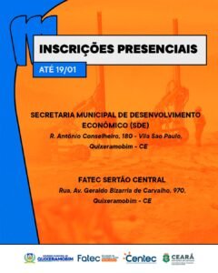 As inscrições seguem até o dia 19 de janeiro e devem ser realizadas presencialmente na Secretaria do Desenvolvimento Econômico (SDE) ou na Fatec Sertão Central, de segunda a sexta-feira, no horário das 8h às 12h e das 13h às 17h.