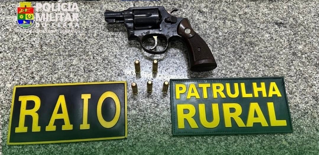 Durante a aproximação, os agentes visualizaram um revólver sendo arremessado para um terreno baldio nos fundos da casa. O armamento — um revólver Taurus calibre .38, de numeração 1733941, capacidade para seis tiros — foi encontrado e apreendido no local. Além da arma, os policiais recolheram seis munições intactas do mesmo calibre.