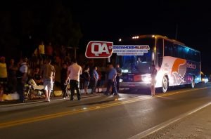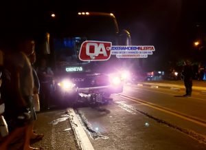 Em decorrência da colisão a motocicleta foi parar embaixo do ônibus da empresa Fretcar. Na referida motocicleta trafegava uma mulher e uma criança.