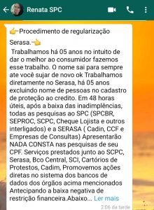 De acordo com informações uma mulher que se identificar como Renata, nas redes sociais, estaria aplicado golpes, a mesma faz divulgação em redes sociais dizendo que trabalha com regularização no Serasa, e quando os clientes comentam na publicação e deixam o contato, a mesma entra em contato através do WhatsApp e cobra uma taxa de aproximadamente R$ 280,00 reais por um determinado serviço, após receber o valor, a mesma não responde mais os clientes e excluí as publicações feitas por ela nas redes sociais.