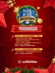 O clima natalino já toma conta de Quixeramobim com a divulgação da programação oficial do Natal de Luz, promovido pelo Governo Municipal. As atividades acontecem em diferentes datas e locais da cidade, reunindo momentos culturais, musicais e religiosos para toda a população.