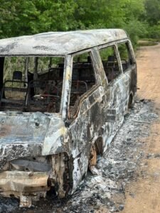 O vereador João Pedro esteve no local e mostrou como ficou o veículo após ser completamente consumido pelas chamas, resultando em perda total.