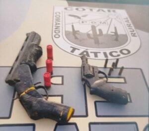Ao chegarem, os agentes realizaram um cerco à residência. A entrada no imóvel foi autorizada pelo proprietário. Durante as buscas, dois suspeitos foram localizados e detidos. Com eles, foram apreendidas uma espingarda calibre 12 de fabricação artesanal, acompanhada de três munições intactas, e um revólver calibre .38, com cinco munições intactas.