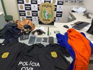 O casal estava em uma motocicleta furtada no momento da captura. Os suspeitos acompanharam os policiais até sua residência, onde foram encontradas três camisas bordadas com nome da Polícia Civil, outras três camisas pretas, uma balaclava, uma mochila e documentos e cartões com os nomes dos suspeitos, quatro aparelhos celulares, uma chave utilizada para roubar carros, além da motocicleta furtada e de um carro com registro de roubo e placa adulterada.