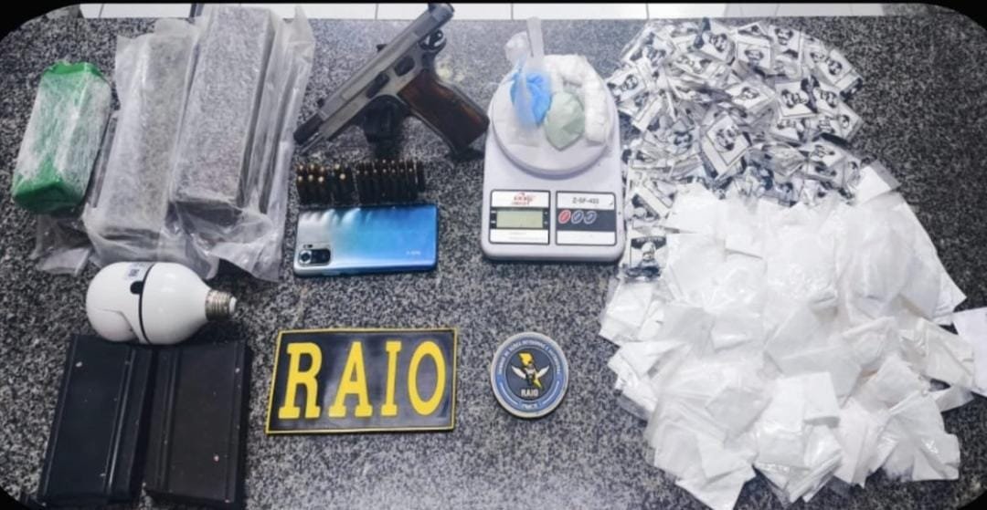Uma operação do RAIO resultou na apreensão de uma grande quantidade de drogas, armas e munições na noite de domingo (21), no bairro Santa Terezinha, em Pedra Branca, no Sertão Central do Ceará. Um homem de 24 anos foi preso em flagrante durante a ação.