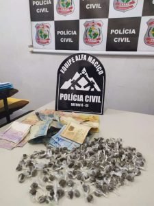 Após o recebimento de informações acerca do tráfico de drogas em uma residência na região, uma equipe policial se deslocou até o local e observou uma movimentação característica de traficância de entorpecentes. Na diligência, os policiais cercaram a área da residência e durante a abordagem policial, o suspeito tentou empreender fuga mas foi capturado no momento em que tentava pular uma janela. Na ação, foram apreendidos 169 papelotes de maconha prontos para a venda, a quantia de R$ 241,00 em dinheiro trocado e um aparelho celular, que foi localizado pelos agentes dentro de um balde de água, na tentativa do suspeito de se desfazer do aparelho.
